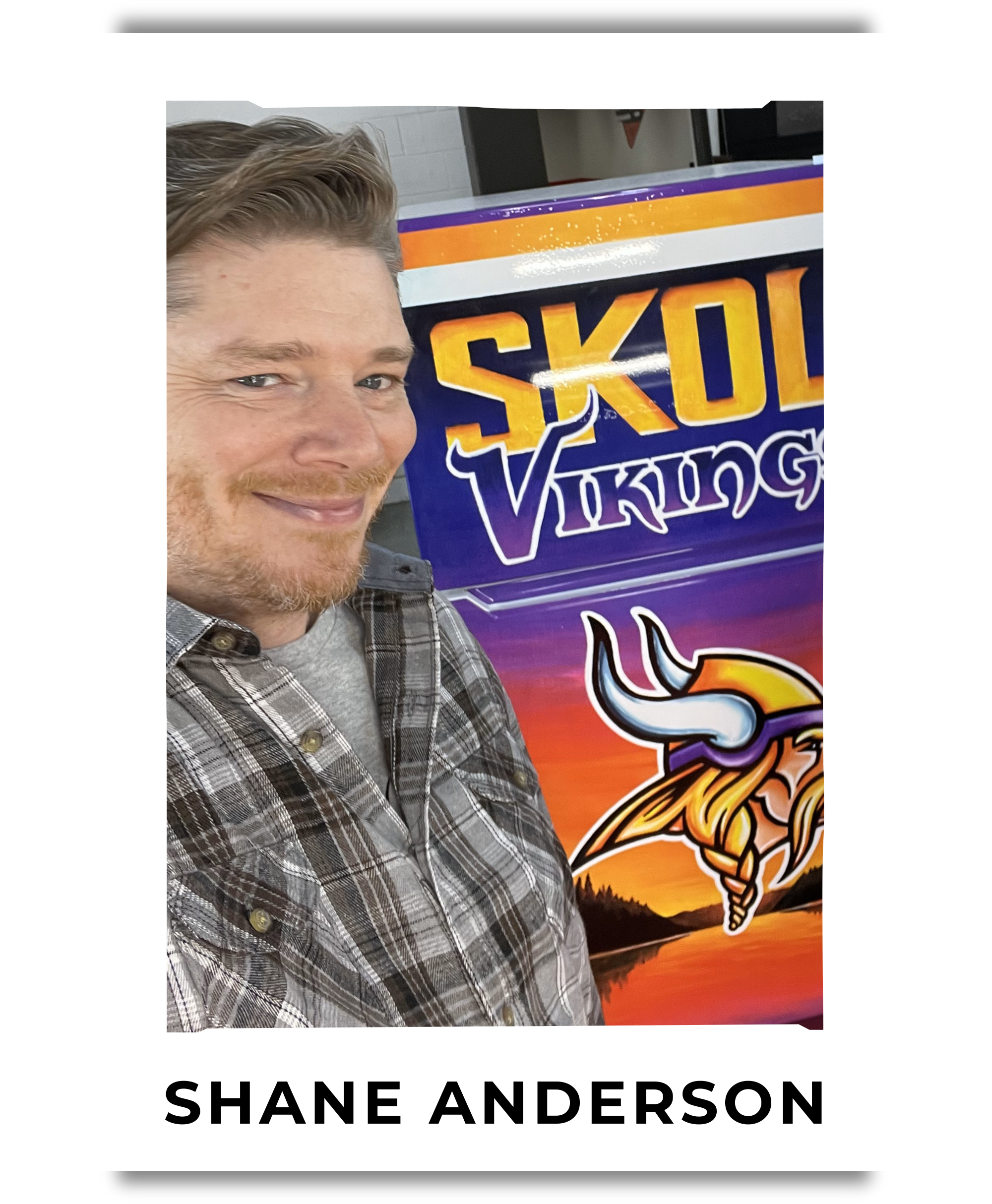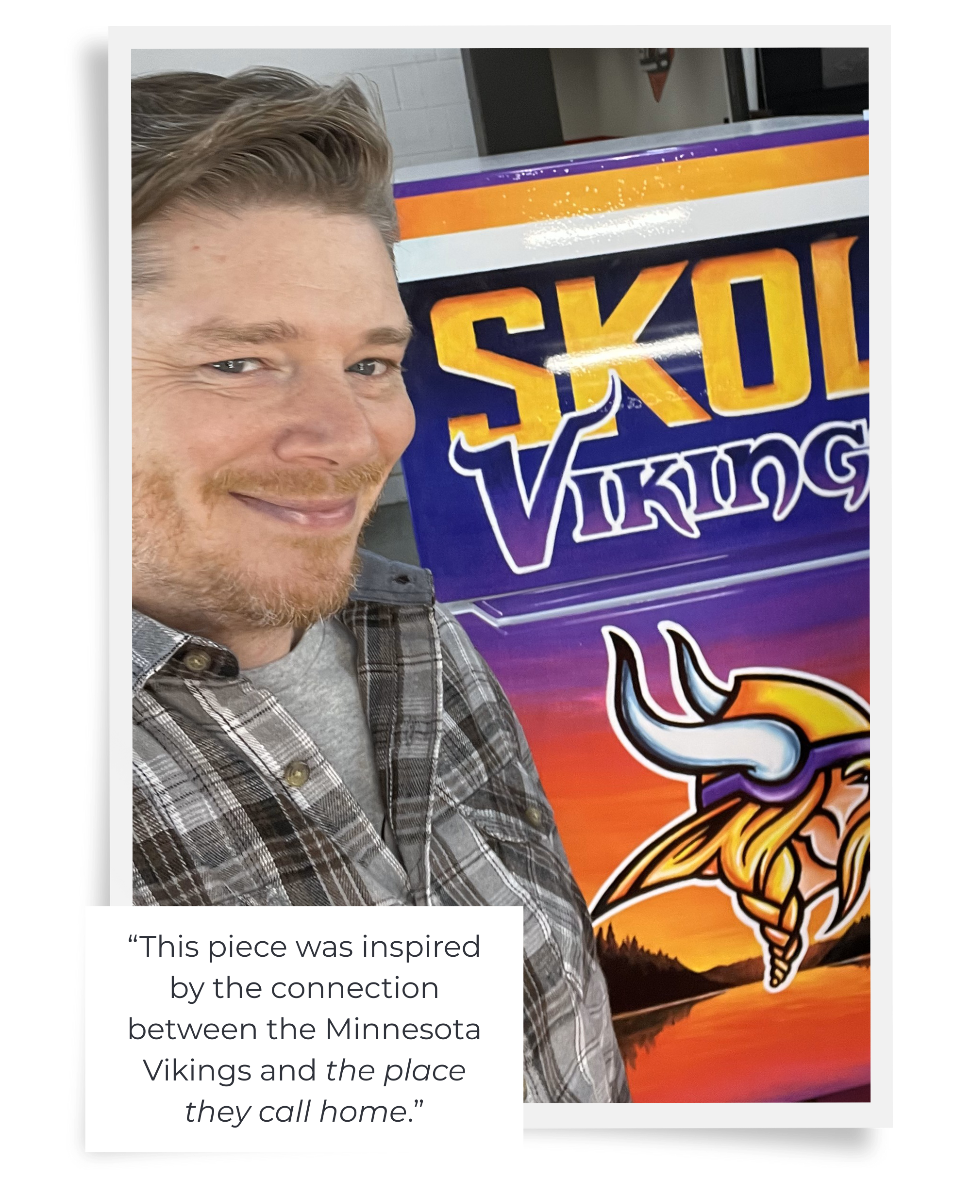 A professional since 2007, Shane has collaborated with high-profile clients such as the St. Paul Winter Carnival, the NCAA Women’s Final Four, and the Minnesota Vikings—producing stadium artwork, custom shoes, footballs, and custom painted helmets for visiting team ownership at U.S. Bank Stadium.